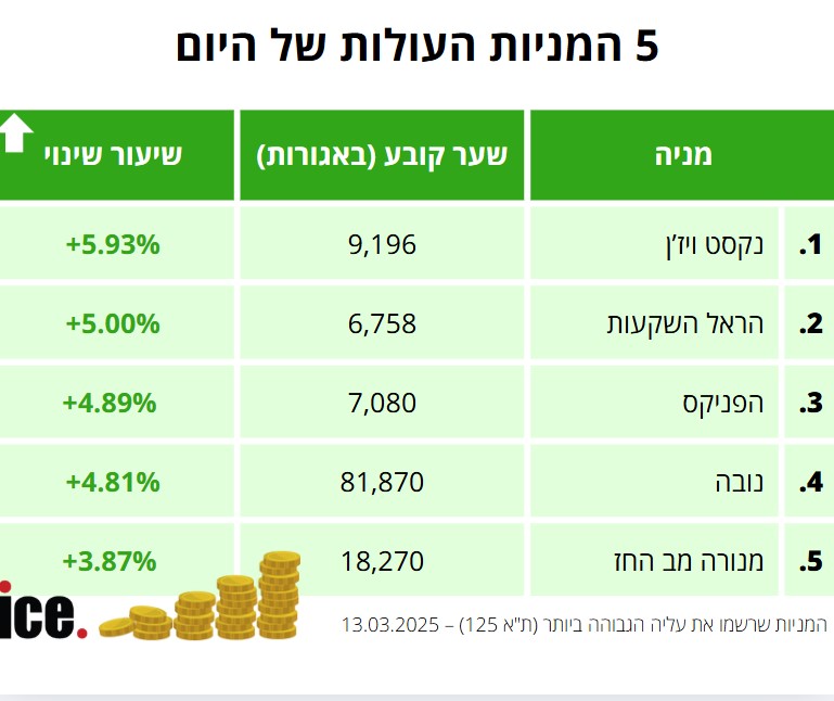 בקרב חמש המניות העולות, המנצחת היא חברת נקסט ויז'ן שמנייתה עלתה ב-5.93% לרמה של 9,196 אגורות. נתון חיובי זה נרשם במקביל לעסקת הענק החדשה של נקסט ויז'ן. כזכור, מוקדם יותר היום דיווחה החברה על קבלת ההזמנה הגדולה ביותר בהיקף של כ-30 מיליון דולר. במקום השני, מופיעה חברת הראל השקעות שמנייתה צמחה ב-5% לרמה של 6,758 אגורות.