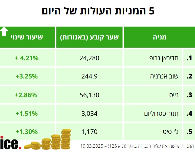 בקרב חמש המניות העולות, המנצחת הגדולה היא חברת תדיראן גרופ שמנייתה עלתה ב-4.21% לרמה של 24,280 אגורות. מנייתה של חברת שוב אנרגיה צמחה ב-3.25% לרמה של 244.9 אגורות.
