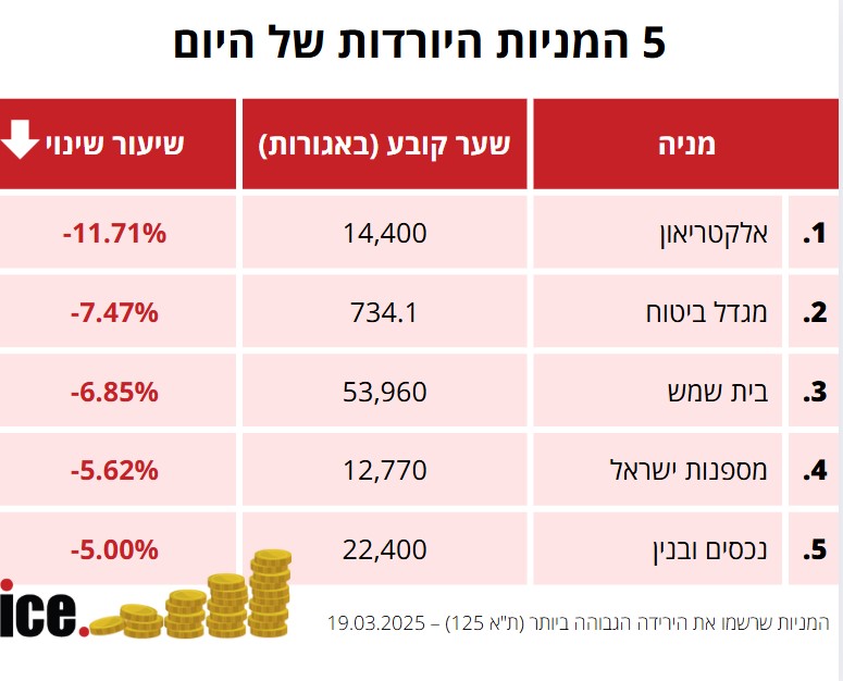בקרב חמש המניות היורדות, המפסידה היא חברת אלקטריאון שמנייתה ירדה ב-11.71% לרמה של 14,400 אגורות. מנייתה של חברת מגדל צנחה ב-7.47% לרמה של 734.1 אגורות.