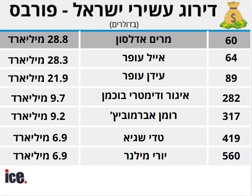 דירוג עשירי ישראל על פי מגזין "פורבס": מרים אדלסון מככבת במקום הראשון עם הון שמוערך ב-28.8 מיליארד דולר. אייל ועידן עופר רושמים הישג מרשים עם עלייה ברווחים | כל הפרטים