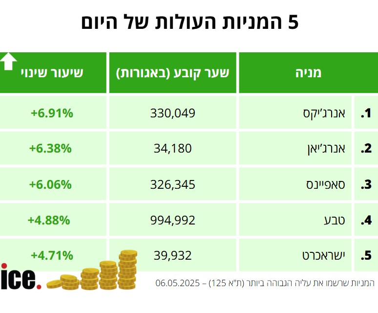 העליות הבולטות במדד ת"א 125: מניות חברות האנרגיה רשמו יום מצוין, כאשר מעל כולן אנרג'יקס שעלתה ב-6.91% לרמה של 330,049 אגורות. מיד אחריה מניית אנרג'יאן, שטסה ב-6.38% לרמה של 34,180 אגורות.
