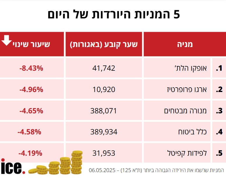 בגזרת הירידות הבולטות של היום במדד ת"א 125: אופקו הלת' מתרסקת ב-8.43% לרמה של 41,742 אגורות. אחריה מניית ארגו פרופרטיז, שירדה ב-4.94% לרמה של 28,133 אגורות.