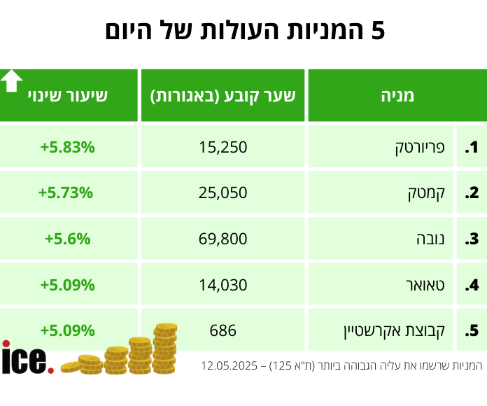 בקרב חמש המניות העולות במקום הראשון נמצאת המניה של פריורטק שעולה בשיעור של 5.83% לרמה של 15,250 אגורות. במקום השני נמצאת המניה של קמטק שרושמת עליה בשיעור של 5.73% לרמה של 25,050 אגורות.