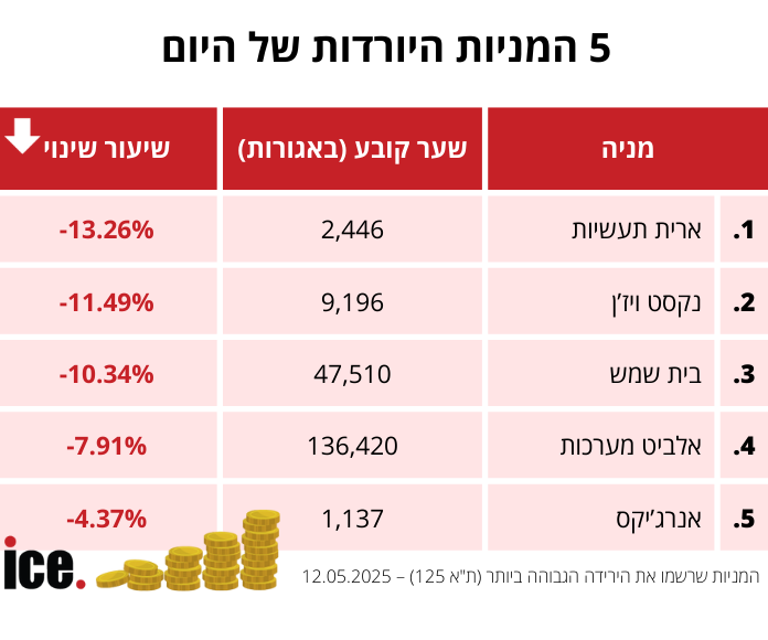 בקרב חמש המניות היורדות, המפסידה הגדולה היא המניה של ארית תעשיות שמתרסקת ורושמת ירידה בשיעור של 13.26% לרמה של 2,446 אגורות. המניה של נקסט ויז'ן מגיעה אל המקום השני וצונחת ב-11.49% לרמה של 9,196 אגורות.