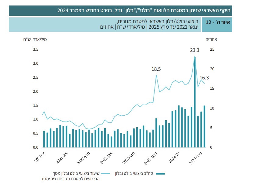 חלק מהנתונים בסקירה מלמדים לא מעט על הסיבות למצב הנוכחי של שוק הנדל"ן. למרות המלחמה, לאורך שנת 2024 הועמד אשראי לדיור בהיקף מצטבר של 93 מיליארד שקל (בדצמבר נצפה שיא, 13.8 מיליארד, על רקע העלאת המע"מ בינואר והרצון להקדים תשלומים). בחודשים ינואר ופברואר הועמד אשראי לדיור בהיקף מצטבר של כ-15 מיליארד שקל - כמעט 35% יותר מהתקופה המקבילה ב-2024. הבעיה היא שגם באשראי שניתן בעבור הלוואות מסוג "בולט" או "בלון" נצפה גידול, שלטענת הבנק מקורו בהלוואות מסוג סבסוד יזמים (הלוואה לדיור המועמדת לרוכש שבה הריבית מהוונת ומשלם אותה היזם, במועד נטילת ההלוואה או בהמשך), שגם שווקו במסגרת הטבות המימון.