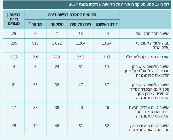 נתון מעניין נוסף הוא המספרים של המשכנתאות מ-2024. במהלך השנה נלקחו כ-89 אלף הלוואות חדשות, כאשר גובה הלוואה ממוצעת הוא כמיליון שקל. כ-75% היו הלוואות למטרת רכישת דירה והיתר - הלוואות שנלקחו בביטחון דירת מגורים. מרבית ההלוואות שנלקחו לרכישת דירה הן לרכישת דירה ראשונה. עוד נמצא, כי מרבית ההלוואות שיש בהן רכיב הכולל הלוואת "בולט" או "בלון" ניתנו לרוכשי דירה חליפית. למעלה ממחצית מההלוואות שנלקחו בשנת 2024 כללו הצמדה למדד המחירים לצרכן.