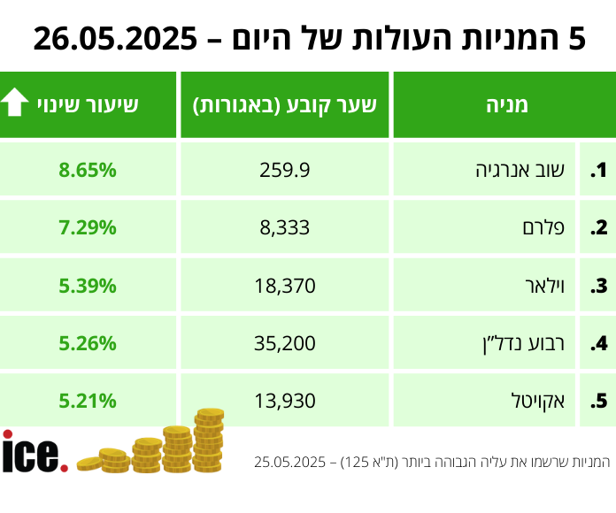 בקרב חמש המניות העולות, מניית שוב אנרגיה במקום הראשון עם עליה של 8.65% לרמה של 259.9 אגורות. מניית פלרם במקום השני עם עליה של 7.29% לרמה של 8,333 אגורות.