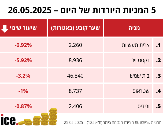 המניה השלישית היא בית שמש, עם ירידה של 3.2% לרמה של 46,840 אגורות. במקום הרביעי שטראוס עם ירידה של 1% לרמה של 8,737 אגורות, ובמקום החמישי ורידיס, עם ירידה של 0.87% לרמה של 2,406 אגורות.