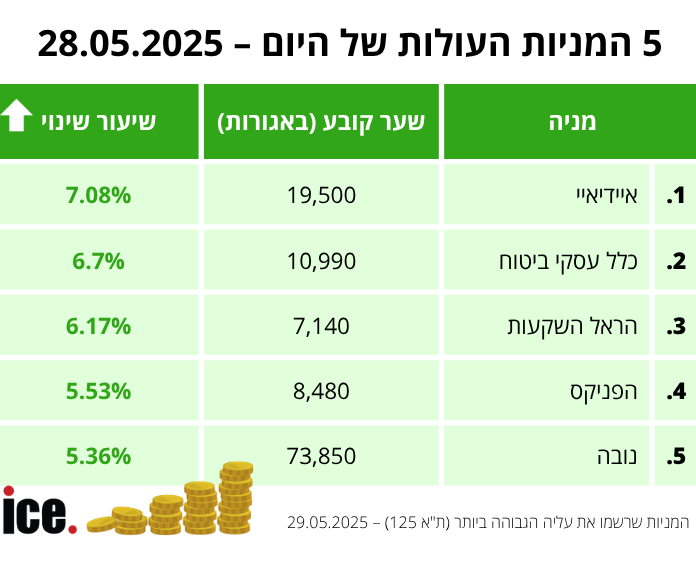 בקרב חמש המניות העולות, במקום הראשון המינה של איי.די.איי ביטוח שמזנקת בשיעור של 7.08% לרמה של 19,500 אגורות. אחריה במקום השני נמצאת המניה של כלל עסקי ביטוח, שעולה ב-6.7% לרמה של 10,990 אגורות.