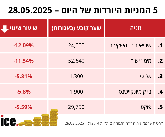 בקרב חמש המניות היורדות, המפסיקה הגדולה היא IBI בית השקעות, שמתרסקת ויורדת בשיעור של 12.09% לרמה של 24,000 אגורות. במקום השני נמצאת המניה של מימון ישיר שנופלת ומאבדת מערכה 11.54% לרמה של 52,640 אגורות.