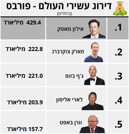 דירוג עשירי העולם של מגזין "פורבס": אילון מאסק ממשיך לחגוג בפסגה עם הון מטורף של כמעט 430 מיליארד דולר. צוקרברג ובזוס ממשיכים להתכתש בקרב על הסגנות, וורן באפט מרוויח בגדול ולארי אליסון מפסיד בענק