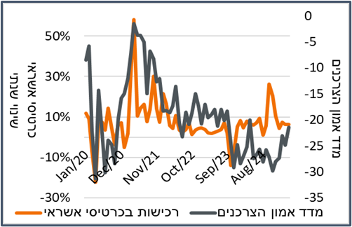 שינוי שנתי ברכישות בכרטיסי אשראי ומדד אמון הצרכנים