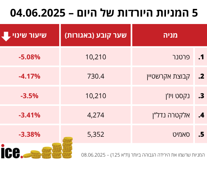 בקרב חמש המניות היורדות, המפסידה הגדולה היא פרטנר שמאבדת מערכה 5.08% לרמה של 2,263 אגורות. במקום השני נמצאת המניה של קבוצת אקרשטיין, שיורדת בשיעור של 4.17% לרמה של 730.4 אגורות.