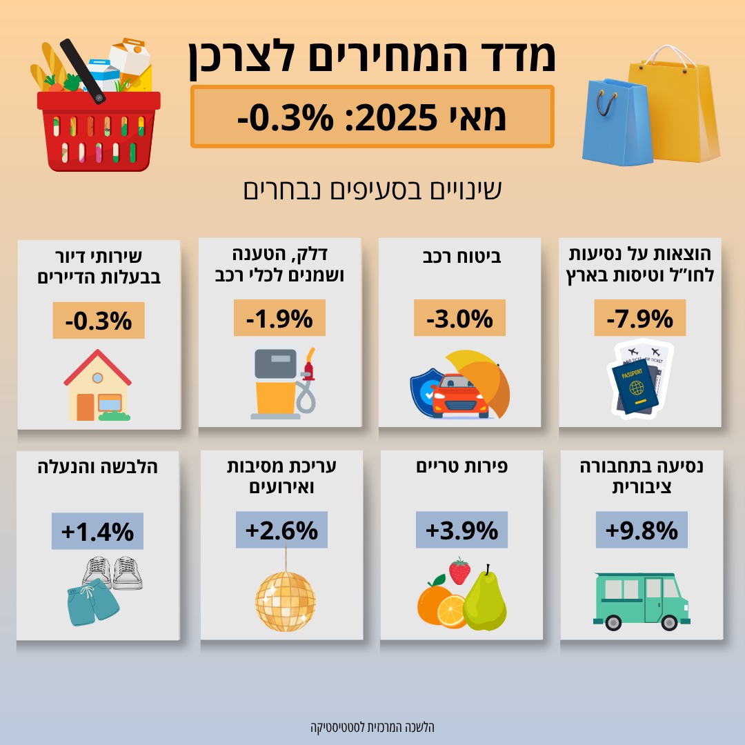 הלשכה המרכזית לסטטיסטיקה פרסמה היום (ראשון) את מדדי המחירים לחודש מאי 2025, מהם עולה כי מדד המחירים לצרכן ירד ב-0.3% לעומת חודש אפריל. ב-12 החודשים האחרונים נרשמה אינפלציה שנתית של 3.1%, בתוך גבול היעד העליון של בנק ישראל.
