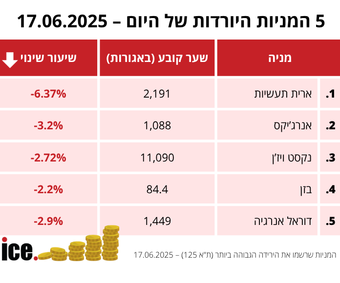 בקרב חמש המניות היורדות של היום, המפסידה הגדולה היא ארית תעשיות שמתרסקת ויורדת בשיעור של 6.37% לרמה של 2,191 אגורות. במקום הרביעי נמצאת המניה של אנרג'יקס שיורדת ב-3.2% לרמה של 1,088 אגורות.