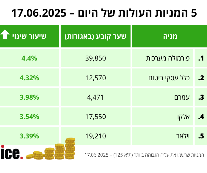 למרות המלחמה בין ישראל לאיראן במסגרת מבצע "עם כלביא" הבורסה לניירות ערך בתל אביב רשמה גם היום מגמה חיובית כאשר שני המדדים המרכזיים רושמים עליות