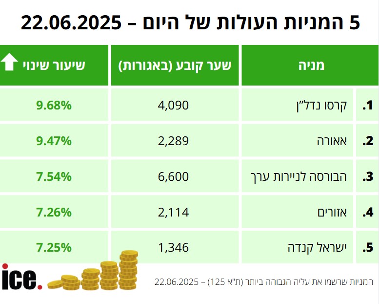 הבורסה לניירות ערך בתל אביב נסגרה היום (ראשון) עם עליות בשני המדדים המרכזיים. מדד ת"א 35 עלה ב-1.53% לרמה של 2,877.78 נקודות ומדד ת"א 125 עלה ב-1.77% לרמה של 2,919.62 נקודות. בקרב חמש המניות העולות, המנצחת היא חברת קרסו נדל"ן שמנייתה עלתה ב-9.68% לרמה של 4,090 אגורות.