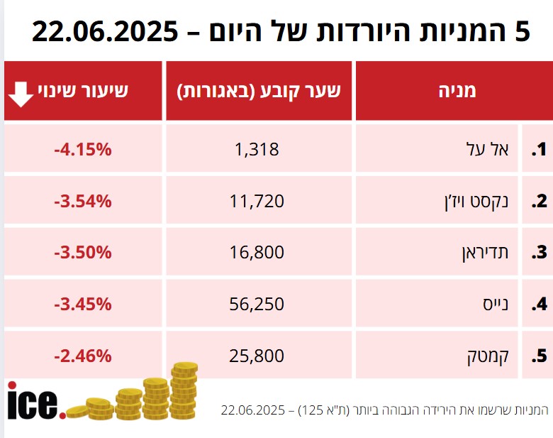 בקרב חמש המניות היורדות, המפסידה היא חברת התעופה אל על שמנייתה ירדה ב-4.15% לרמה של 1,318 אגורות. אחריה, מופיעה חברת נקסט ויז'ן שמנייתה צנחה ב-3.54% לרמה של 11,720 אגורות.