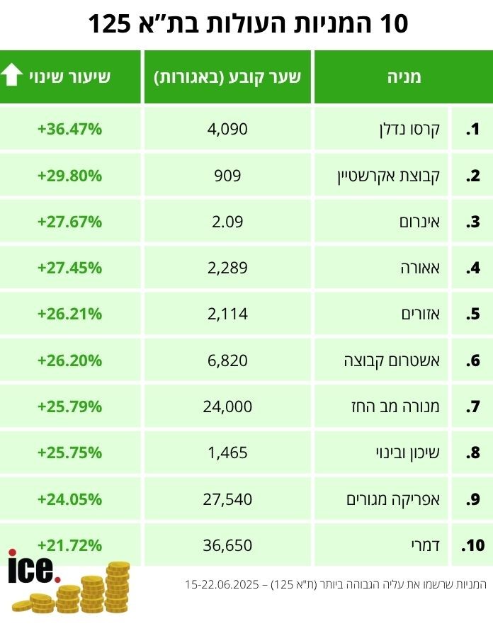 התוצאה, כפי שמשתקף במדד ת"א 125, היא זינוק שבועי של עשרות אחוזים במניות המובילות בענף, המאותתות על אמון מלא בחוסנו וביכולתו של המשק הישראלי להיבנות מחדש, ובגדול.
