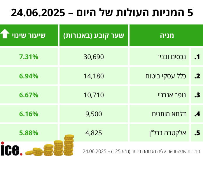 לאחר כניסת הפסקת האש בין ישראל לאיראן לתוקף, הבורסה לניירות ערך בתל אביב רשמה יום חיובי נוסף בשני המדדים המרכזיים; מדד ת"א 35 עלה בשיעור של 1.26% ומדד ת"א 125 עלה בשיעור של 1.47%