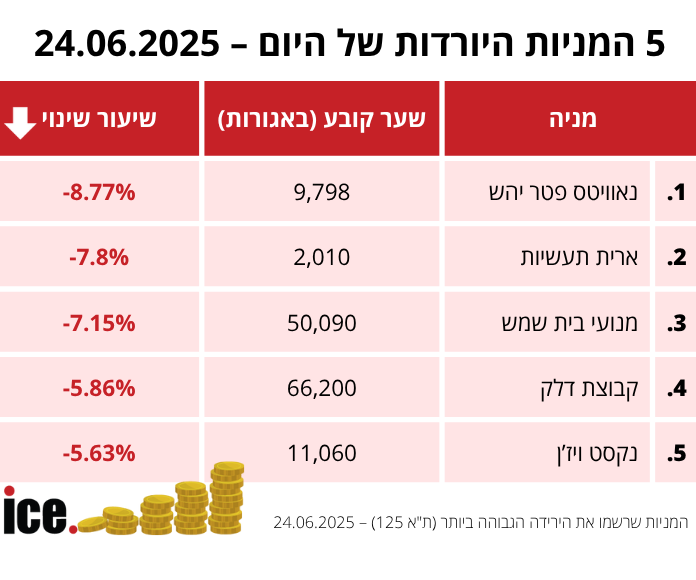 בקרב חמש המניות היורדות, המפסידה הגדולה היא המניה של נאוויטס פטר יהש, שמתרסקת ומאבדת 8.77% מערכה לרמה של 9,798 אגורות. במקום השני נמצאת המניה של ארית תעשיות שיורדת בשיעור של 7.8% לרמה של 2,010 אגורות.