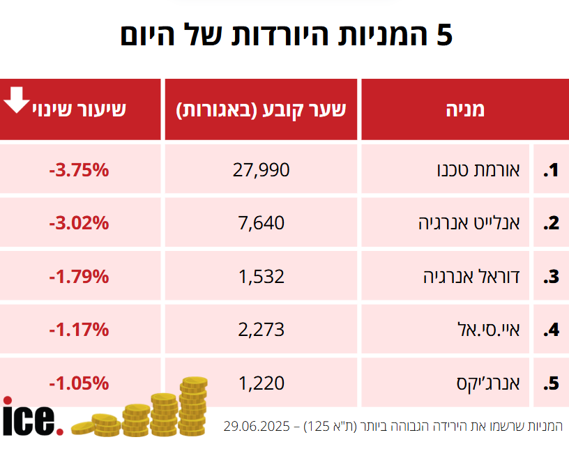 ברשימת המניות שירדו היום, בלטה באדום אורמת טכנו, שצנחה 3.75% לשער 27,990 אגורות, ושתי חברות האנרגיה אנלייט ודוראל, שהידרדרו 3.02% ו-1.79% בהתאמה. איי.סי.אל, חברת הבת של חברה לישראל הנשלטת על ידי עידן עופר, יורדת 1.17% לשער 2,273 אגורות. אנרג'יקס יורדת 1.05% לשער 1,220 אגורות.