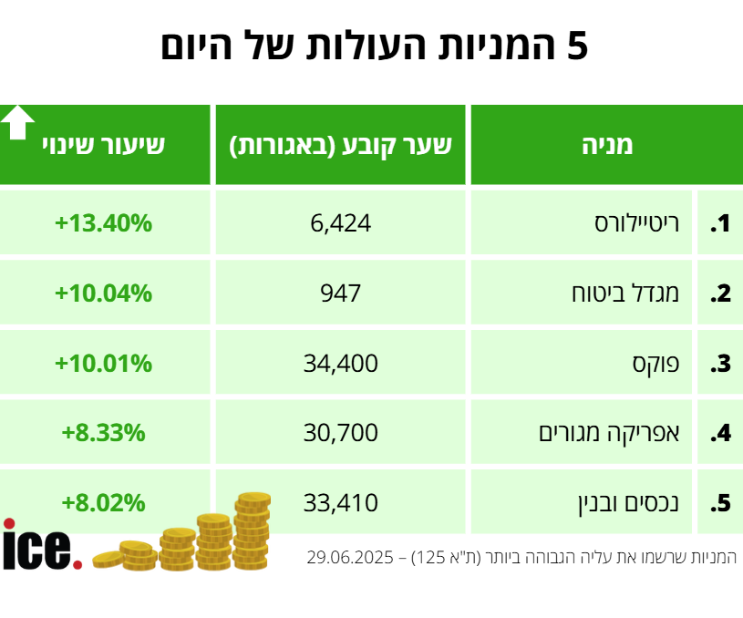 ברשימת העולות הבולטות היום, ריטיילורס של הראל ויזל עפה 13.40% למעלה לרמה של 6,424 אגורות, ומגדל ביטוח מטפסת 10.04% לשער 947 אגורות. פוקס, גם היא בבעלות ויזל עולה בלמעלה מ-10% לשער 34,400 אגורות.