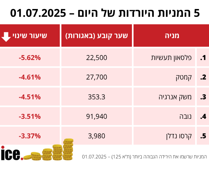 בקרב חמש המניות היורדות, המפסידה הגדולה היא המניה של פלסאון תעשיות, שיורדת בשיעור של 5.62% לרמה של 22,500 אגורות. במקום השני נמצאת המניה של קמטק שיורדת ב-4.61% לרמה של 27,700 אגורות.