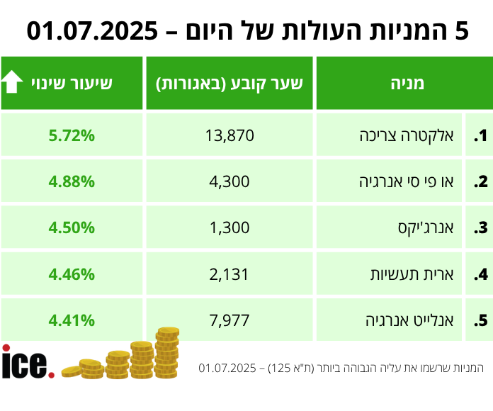 אל המקום השלישי הגיעה המניה של אנרג'יקס שעולה ב-4.5% לרמה של 1,300 אגורות. אחריה, במקום הרביעי נמצאת המניה של ארית תעשיות שרושמת עלייה בשיעור של 4.46% לרמה של 2,131 אגורות. סוגרת את הרשימה, המניה של אנלייט אנרגיה שעולה ב-4.41% לרמה של 7,977 אגורות.