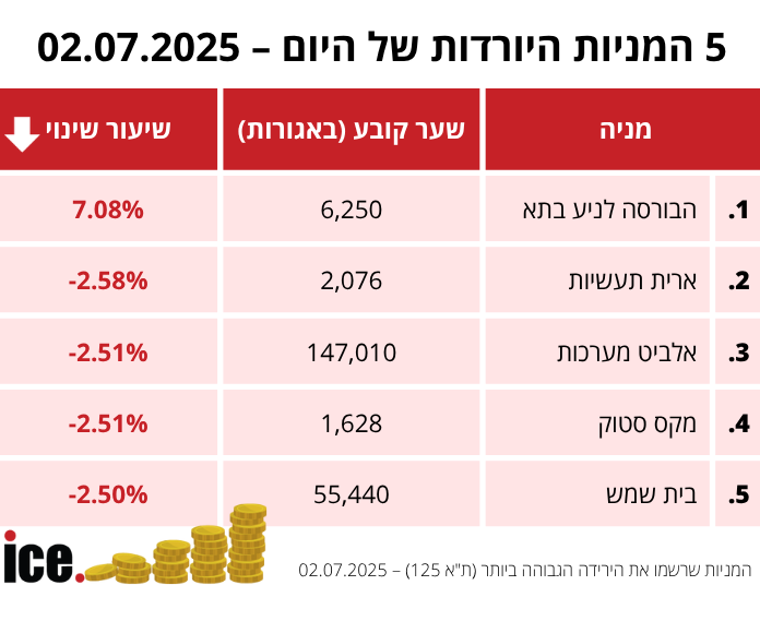 אלביט מערכות ניצבת במקום השלישי בקרב חמש המניות היורדות לאחר שרושמת בסוף יום המסחר ירידה של 2.51% והיא מגיעה לרמה של 147,010 אגורות. מניית מקס סטוק רשומת גם היא ירידה של 2.51% ומגיעה לרמה של 1,628 אגורות. במקום האחרון, מניית בית שמש שיורדת בשיעור של 2.50% לרמה של 55,440 אגורות.