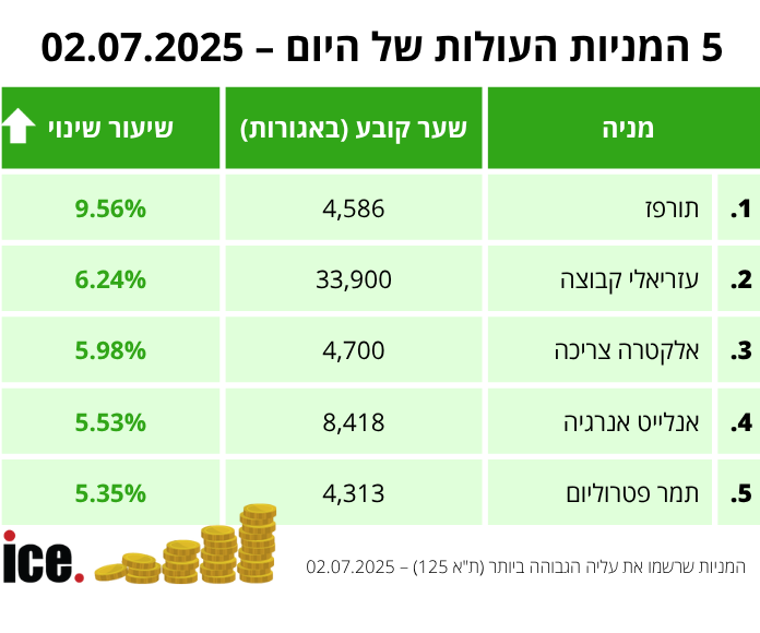 בקרב חמש המניות העולות, במקום הראשון נמצאת המניה של תורפז שמזנקת ב-9.56% ומסכמת עלייה כוללת של 128% מאז תחילת השנה. החברה הודיעה כי תרכוש 68% מאחוזי השליטה ב-Attractive Scent תמורת 27.4 מיליון אירו כחלק כוונותיה של תורפז להתרחב.