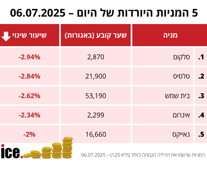 בקרב חמש המניות היורדות, המפסידה הגדולה היא המניה של סלקום שמאבדת 2.49% מערכה לרמה של 2,870 אגורות. במקום השני נמצאת המניה של טלסיס שירדה בשיעור של 2.84% לרמה של 21,900 אגורות.