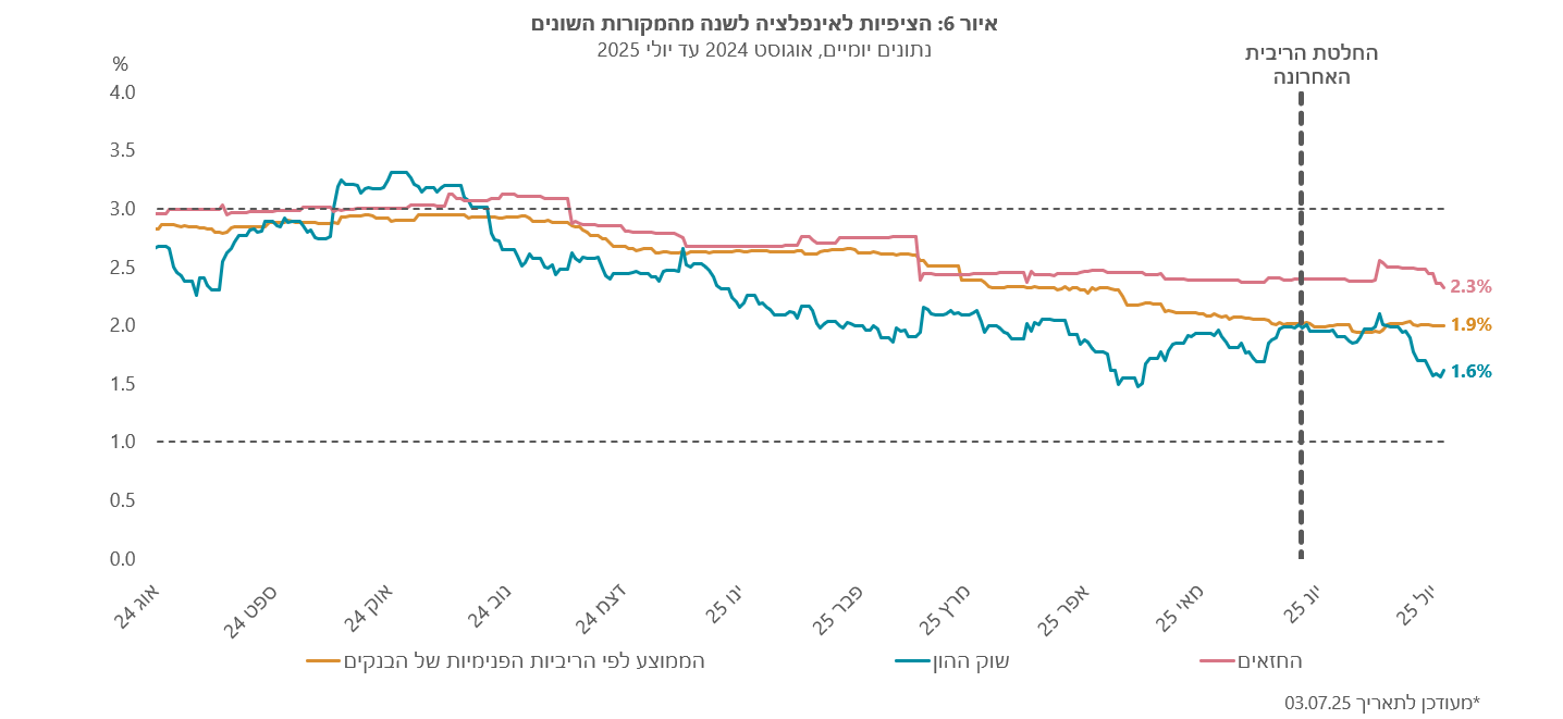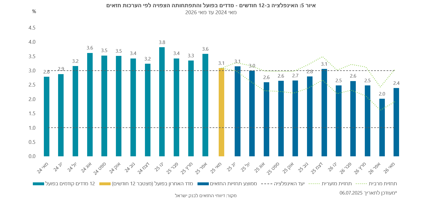 למרות האופטימיות והלחץ בשוק על בנק ישראל להוריד את הריבית, השיקול המרכזי שלו בהחלטת הריבית היה ונשאר האינפלציה, שכאמור עדיין גבוהה מהיעד שהציב הבנק של כ-2%. מדד יוני שצפוי להתפרסם בשבוע הבא צפוי לספק תמונה מורכבת, מאחר והמשק היה כמעט מושבת למשך שבועיים במהלך המלחמה מול איראן. גם מדד יולי צפוי להציג תמונה מורכבת לאור הציפייה להתפרצות ביקושים אחרי סיום המלחמה עם איראן, שעשויה לדחוף את המחירים כלפי מעלה. כל אלו מקשים על בנק ישראל להעריך את תוואי האינפלציה בהמשך.