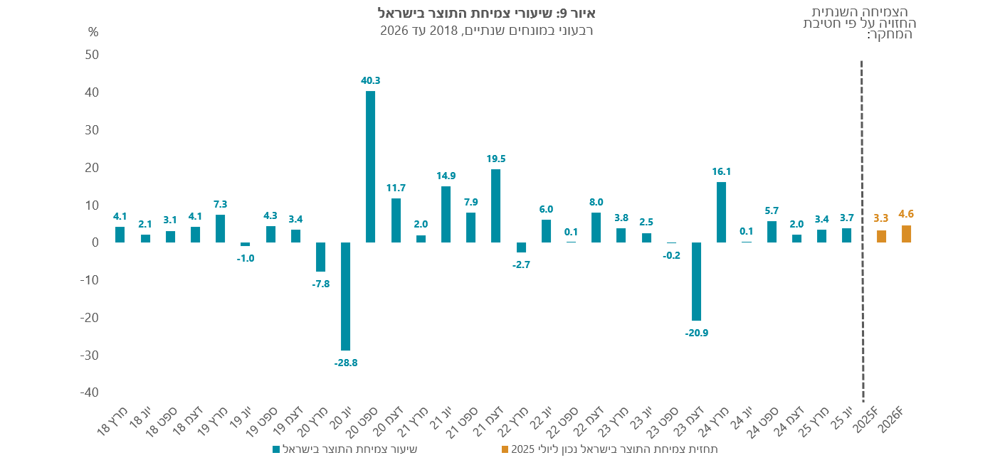 לצד החלטת הריבית, פרסמה חטיבת המחקר של בנק ישראל עד העדכון לתחזיות המאקרו - בבנק ישראל צופים כעת צמיחה של 3.3% ב-2025, צמיחה מתונה יותר לעומת התחזית הקודמת שהייתה לצמיחה של 3.5%, אך התחזית ל-2026 עלתה לצמיחה של 4.6% לעומת תחזית קודמת לצמיחה של 4%.
