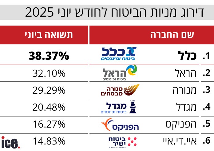 מי שהובילה בחודש יוני היא מניית כלל שזינקה ב-38.37% ביוני. אחריה הראל עם 32.1%, מנורה עם 29.29%, מגדל עם 20.48%, ובתחתית הפניקס עם 16.27% ואיי.די.איי עם 14.83% - אחרי שבחודש מאי הייתה במקום השני.