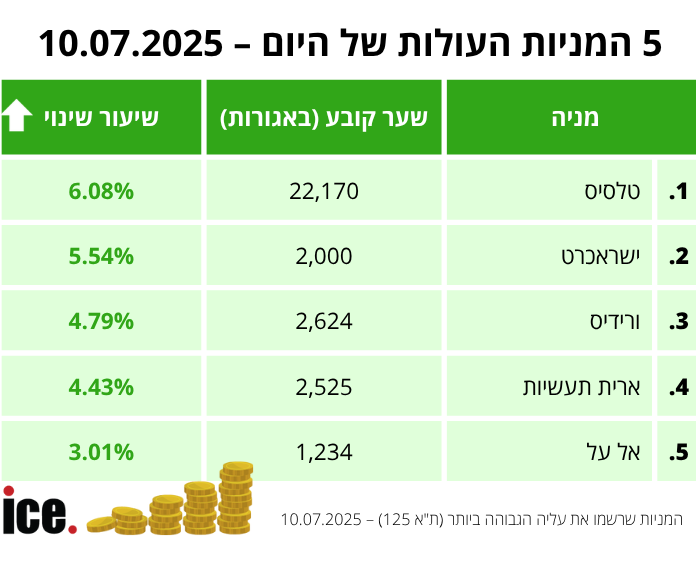אל המקום השלישי, הגיעה המניה של ורידיס, חברה שעוסקת בתחומי איכות הסביבה, שעלתה בשיעור של 4.79% לרמה של 2,624 אגורות. אחריה, במקום הרביעי הגיעה המניה של ארית תעשיות שרשמה עלייה של 4.43% לרמה של 2,525 אגורות. סוגרת את הרשימה, המניה של אל על שעלתה ב-3.01% לרמה של 1,234 אגורות.