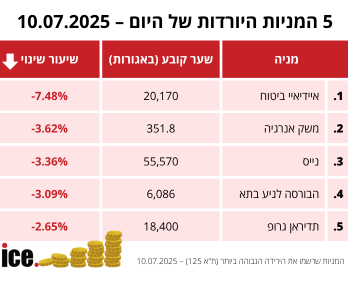 בקרב חמש המניות היורדות, המפסידה הגדולה היא המניה של איידיאיי ביטוח שנופלת ומאבדת 7.48% מערכה לרמה של 20,170 אגורות. במקום השני המניה של משק אנרגיה שירדה בשיעור של 3.62% לרמה של 351.8 אגורות.