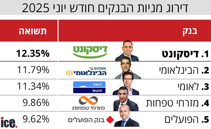 בנק דיסקונט של אבי לוי רשם את התשואה הגבוהה ביותר בחודש יוני האחרון עם עלייה של 12.35%, מעל הבינלאומי (11.79%), לאומי (11.34%), מזרחי טפחות (9.86%) והפועלים (9.62%).