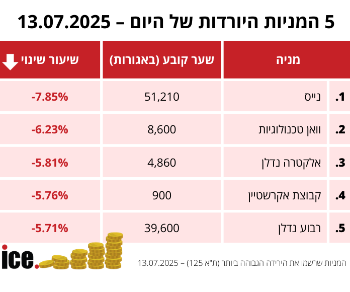 בקרב חמש המניות היורדות, המפסידה הגדולה היא המניה של נייס, שמתרסקת ורושמת ירידה בשיעור של 7.85% לרמה של 51,210 אגורות. במקום הרביעי נמצאת המניה של וואן טכנולוגיות שמאבדת 6.23% מערכה לרמה של 8,600 אגורות.