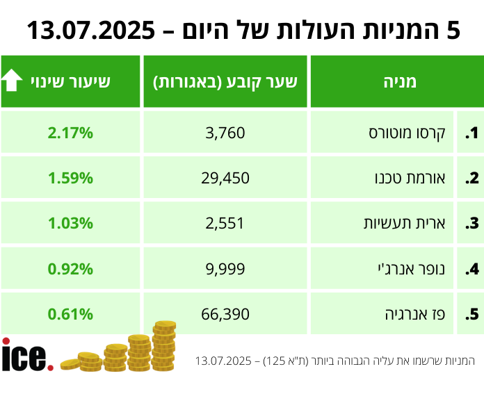 בקרב חמש המניות העולות, במקום ראשון נמצאת המניה של קרסו מוטורס שעלתה בשיעור של 2.17% לרמה של 3,760 אגורות. במקום הרביעי, המניה של אורמת טכנולוגיות שעלתה ב-1.59% לרמה של 29,450 אגורות.