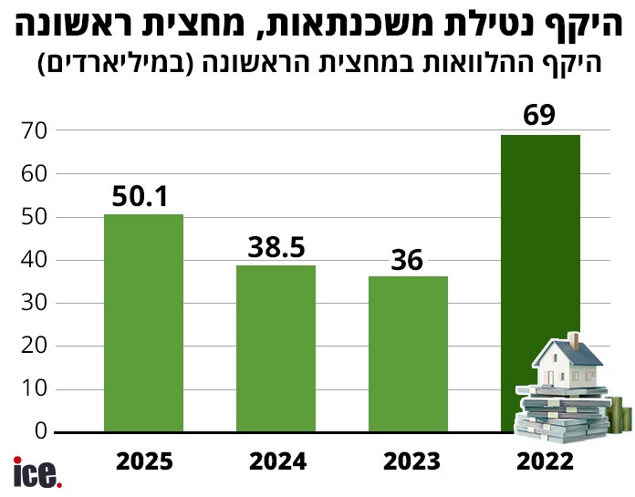 בואו נראה מה קרה במחצית הראשונה של השנה בשנתיים הקודמות: 36 מיליארד שקל במחצית הראשונה של 2023 ובתקופת הפריחה, ב-2022, מספרים כמעט בלתי נתפסים של כ-69 מיליארד שקל. סיכום קצר: הציבור לוקח הלוואות בהיקפים גבוהים מאוד ביחס ל-2023 וגבוהים ביחס ל-2024. כשמסתכלים על שנת השיא, 2022, מקבלים ירידה. אבל זה נתון מפתיע: בתחילת 2023 אמנם היו כאן מחאות ורפורמות, אבל הריבית הייתה נמוכה יותר, עדיין לא החלה המלחמה בעזה ולא מול איראן ובכל זאת - יש כאן פער של כמעט 40%.