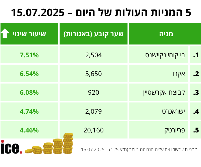בקרב חמש המניות העולות, במקום הראשון נמצאת המניה של בי קומיוניקיישנס, שזינקה בשיעור של 7.51% לרמה של 2,504 אגורות. במקום השני, המניה של אקרו שעלתה ב-6.54% לרמה של 5,650 אגורות.