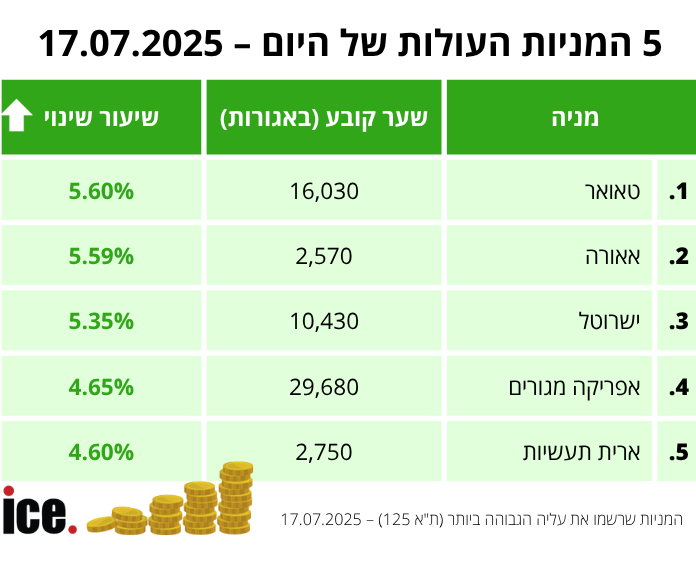 בקרב חמש המניות העולות, המנצחת הגדולה היא המניה של טאואר שזינקה בשיעור של 5.6% לרמה של 16,030 אגורות. במקום השני, נמצאת המניה של אאורה שעלתה ב-5.59% לרמה של 2,750 אגורות.