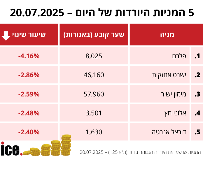 בקרב חמש המניות היורדות, המפסידה הגדולה היא המניה של פלרם, שירדה בשיעור של 4.16% לרמה של 8,025 אגורות. במקום השני נמצאת המניה של ישרס אחזקות שירדה ב-2.86% לרמה של 46,160 אגורות.