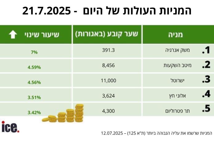 את רשימת המניות העולות של היום פותחת משק אנרגיה שעלתה בשיעור של 7% לרמה של 391.3 נקודות. את המקום השני תופסת מיטב השקעות שעלתה בשיעור של 4.59% לרמה של 8,456 נקודות. ישרוטל במקום השלישי לאחר שעלתה בשיעור של 4.56% לרמה של 11,000 נקודות. את החמישייה הראשונה סוגרות אלוני חץ שעלתה בשיעור של 3.51% לרמה של 3,624 נקודות. תמר פטרוליום סוגרת את הרשימה עם עלייה של 3.42% לרמה של 4,300 נקודות.