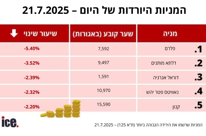 את רשימת המניות היורדות של היום פותחת פלרם שירדה בשיעור של 5.40% לרמה של 7,592 נקודות. במקום השני נמצאת דלתא מותגים לאחר שירדה בשיעור של 3.52% לרמה של 9,497. דוראל אנרגיה במקום השלישי לאחר שירדה בשיעור של 2.39% לרמה של 1,591 נקודות. את החמישייה סוגרות נאוויטס פטר יהש שירדה בשיעור של 2.32% לרמה של 10,970 נקודות וקנון שירדה בשיעור של 2.20% לרמה של 15,590 נקודות.