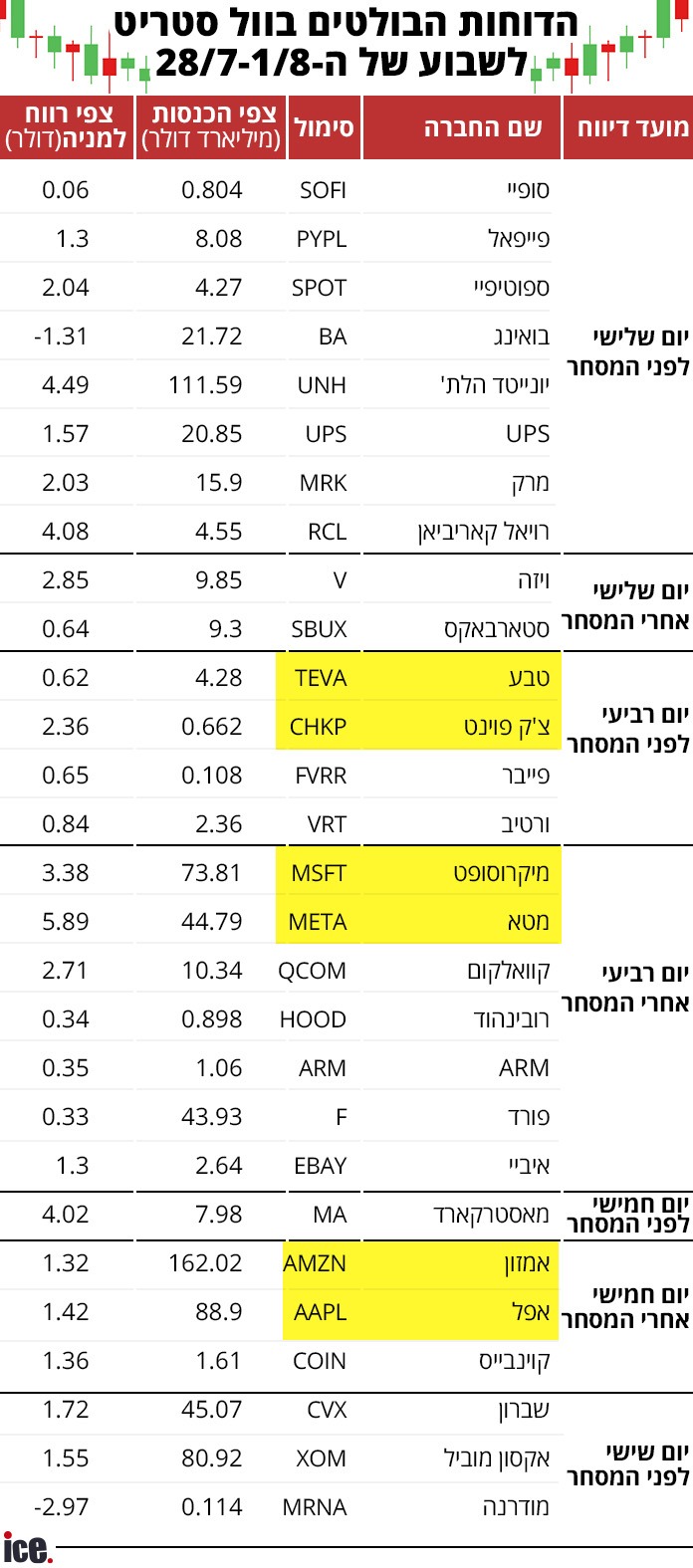 וול סטריט תפתח מחר שבוע נוסף בסימן עונת הדוחות לרבעון השני, כשהשבוע צפוי להיות גדוש בדוחות של החברות הגדולות בשוק. מיקרוסופט, מטא, אפל ואמזון הם השמות הבולטים, אך לצידן ידווחו גם חברות בולטות נוספות לצד מספר ישראליות - ביניהן טבע וצ'ק פוינט.