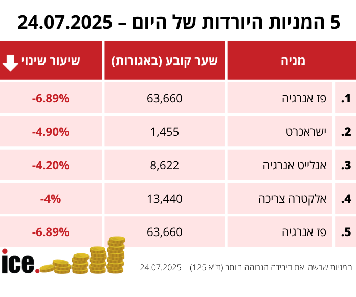 בקרב חמש המניות היורדות, המפסידה הגדולה היא המניה של פז אנרגיה שרשמה ירידה בשיעור של 6.89% לרמה של 63,660 אגורות. במקום השני נמצאת המניה של ישראכרט שיורדת ב-4.9% לרמה של 1,455 אגורות. זאת לאחר שאתמול המניה איבדה 5.73% מערכה.