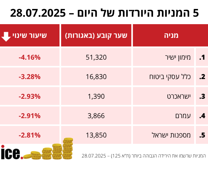 בקרב חמש המניות היורדות, המפסידה הגדולה היא המניה של מימון ישיר שאיבדה מערכה 4.16% לרמה של 51,320 אגורות. במקום השני נמצאת המניה של כלל עסקי ביטוח שיורדת ב-3.28% לרמה של 16,830 אגורות.