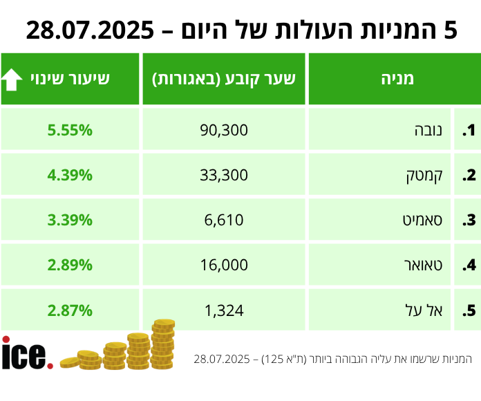 בקרב חמש המניות העולות, המנצחת הגדולה היא המניה של נובה שזינקה בשיעור של 5.55% לרמה של 90,300 אגורות. במקום השני נמצאת המניה של קמטק שרשמה עלייה של 4.39% לרמה של 33,300 אגורות.